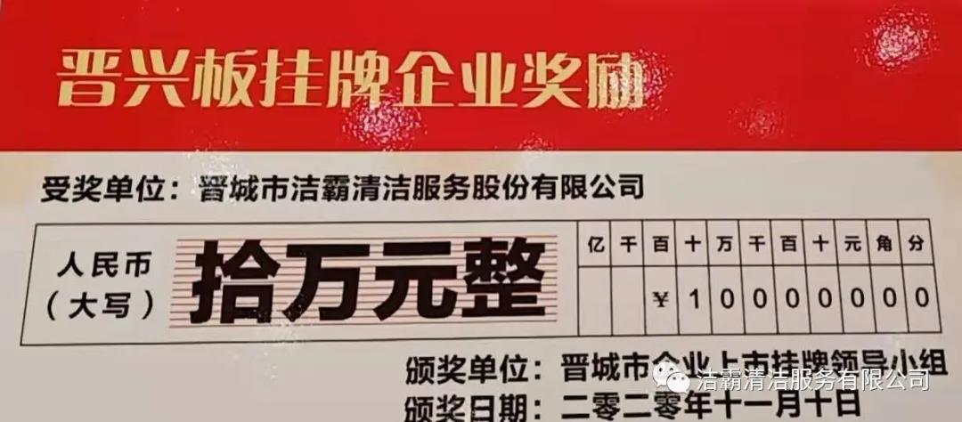 晉城市潔霸清潔服務(wù)股份有限公司于2019年11月27日成功登陸山西股權(quán)交易中心“專精特新板”(晉興板)(企業(yè)代碼:060200Z),是“專精特新板”開板暨首批掛牌的14家企業(yè)之一!皩>匦掳濉笔巧轿鞴蓹(quán)交易中心設(shè)立的特色板塊,為省內(nèi)具備專業(yè)化、精細(xì)化、特色化、新穎化的優(yōu)質(zhì)企業(yè)提供專屬服務(wù),成為帶動全省中小企業(yè)創(chuàng)新創(chuàng)造、轉(zhuǎn)型升級,壯大工業(yè)高質(zhì)量發(fā)展的生力軍。“晉興板”掛牌,標(biāo)志著公司正式進(jìn)軍資本市場,豐富了融資渠道,推動公司高質(zhì)量轉(zhuǎn)型發(fā)展,成為公司發(fā)展的新引擎。