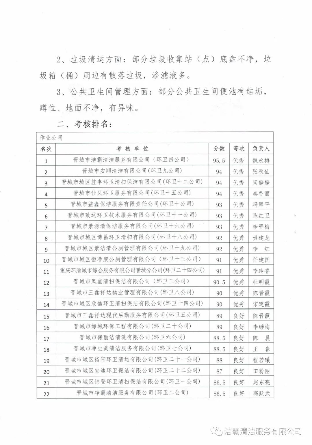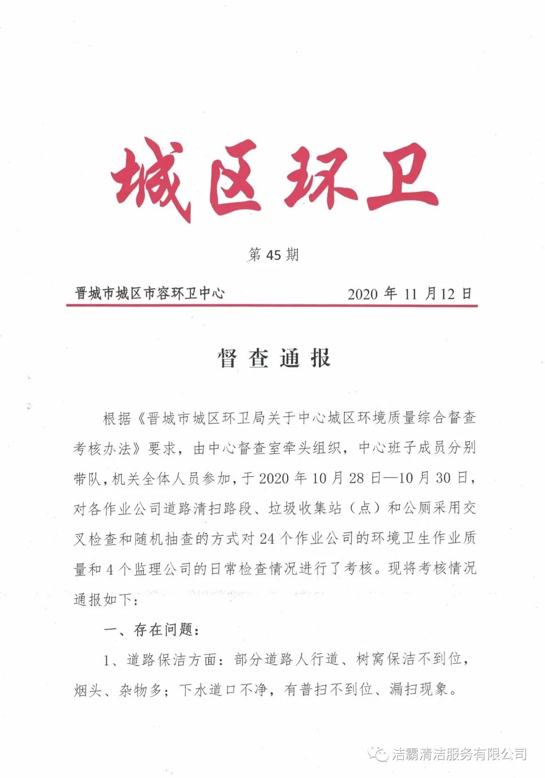 2020年10月28日—10月30日,晉城市城區(qū)市容環(huán)衛(wèi)中心由中心督查室牽頭組織,中心班子成員分別帶隊,機關(guān)全體人員參加,對各作業(yè)公司道路清掃路段、垃圾收集站(點)和公廁采用交叉檢查和隨機抽查的方式對24個作業(yè)公司的環(huán)境衛(wèi)生作業(yè)質(zhì)量和4個監(jiān)理公司的日常檢查情況進行了考核。晉城市潔霸清潔服務(wù)股份有限公司所屬的環(huán)衛(wèi)四公司分?jǐn)?shù)最高,名列第一。