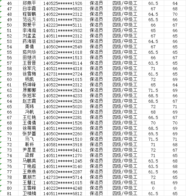 晉城市潔霸清潔服務股份有限公司職業(yè)技能等級認定中心現將2024年1月27日下午認定人員成績公示如下: