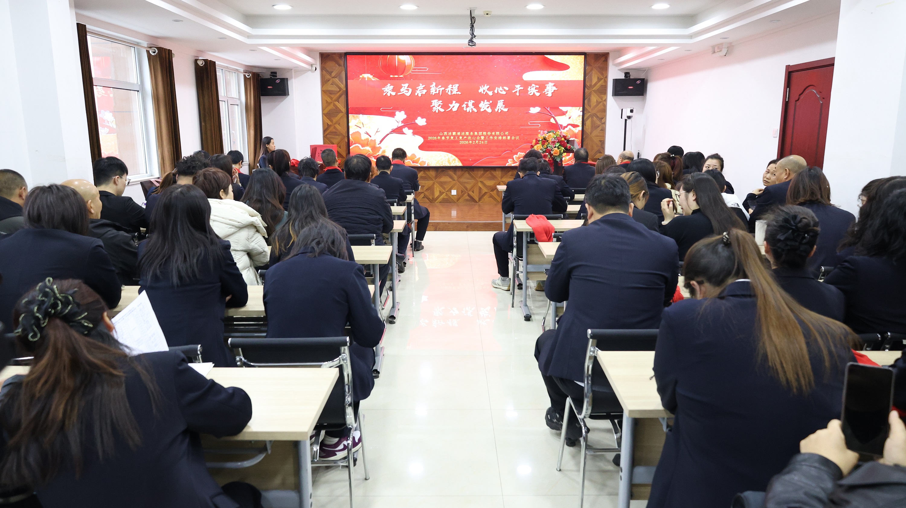 會議召開前,山西潔霸物業(yè)、合眾力勞務(wù)派遣、辦公室、保潔部、百潔物業(yè)、潔霸超市、潔霸洗業(yè)、財(cái)務(wù)部、清洗一部、清洗二部、清洗三部、運(yùn)營中心、職業(yè)培訓(xùn)學(xué)校、人力資源部、智能科技等子公司和部門分別登臺展示團(tuán)隊(duì)士氣和精神風(fēng)貌,集中展現(xiàn)2026年的奮斗目標(biāo)和決心,凝聚團(tuán)隊(duì)向心力。